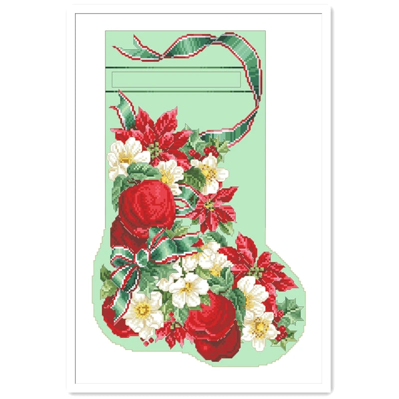 Dit prachtige borduurpakket brengt een warme en feestelijke sfeer in huis. De afbeelding toont een elegante kerstsok gevuld met appelrozen, subtiel omgeven door winterse details. Ideaal om te borduren als sfeervol decorstuk voor de feestdagen.