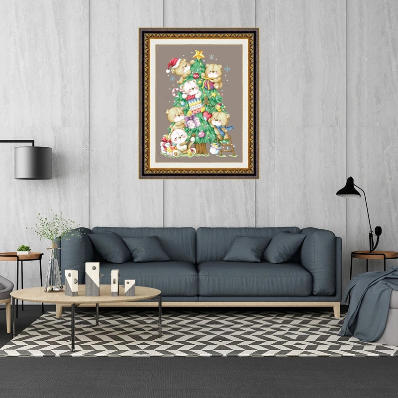 Borduurpakket Kerstbeer met Boom – Kruissteekset voor de Feestdagen