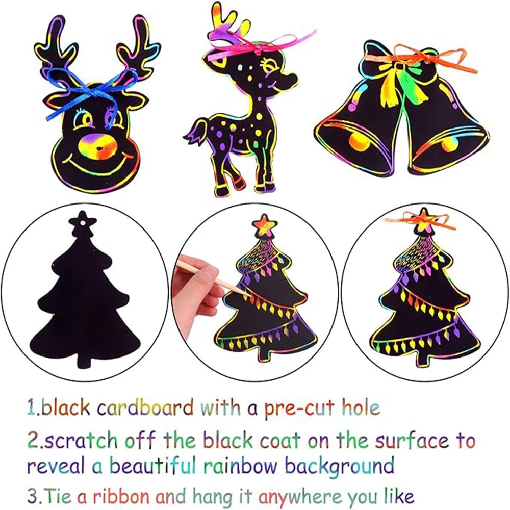 Breng de kerstsfeer tot leven met deze magische krastekeningen! Deze complete set bevat 12 krasornamenten met verschillende kerstpatronen, 6 houten krasstokjes en 12 linten, allemaal verpakt in een mooie geschenkdoos.