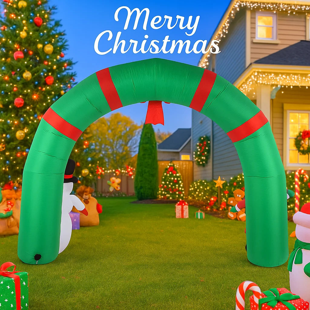 Creëer direct een magische kerstsfeer met deze prachtige opblaasbare boog van circa 310 cm hoog. De vrolijke sneeuwman en de vriendelijke kerstman verwelkomen jouw gasten met warmte en licht. Perfect geschikt voor in de tuin, op het gazon, bij de voordeur of als blikvanger tijdens een feestelijke kerstviering. De geïntegreerde LED-verlichting zorgt voor een sfeervol effect, zowel overdag als ’s avonds.